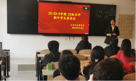为进一步营造良好的外语学习环境,培养浓郁的外语学习风气,提升教学质量,倾听学生心声,人文学院公共外语教研室于4月18日在人文楼4004、4005、4006教室召开期中师生座谈会。公共外语教研室任课教师和各二级学院学生代表参加,座谈会由倪静老师主持。