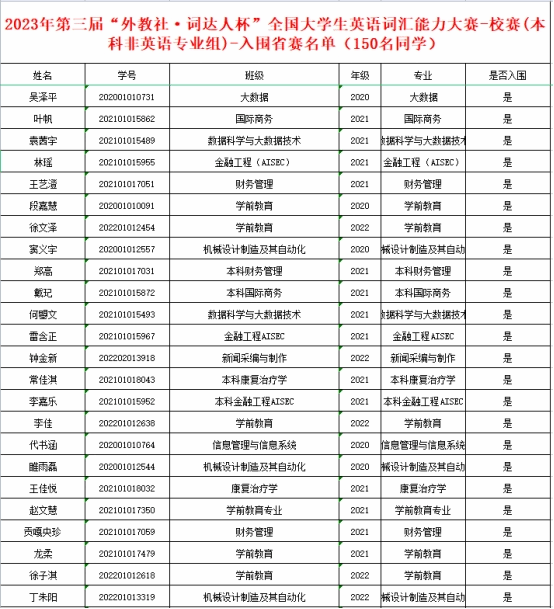 由人文学院举办的第三届“外教社·词达人杯”全国大学生英语词汇能力大赛365英国上市网站官网校赛于4月9日上午顺利结束。365官网共有2538名学生参赛,其中英语专业289人,非英语专业2249人。经过校赛的激烈角逐,365官网共有172名学生晋级了省赛,其中非英语专业150人,英语专业22人。晋级省赛名单如下: