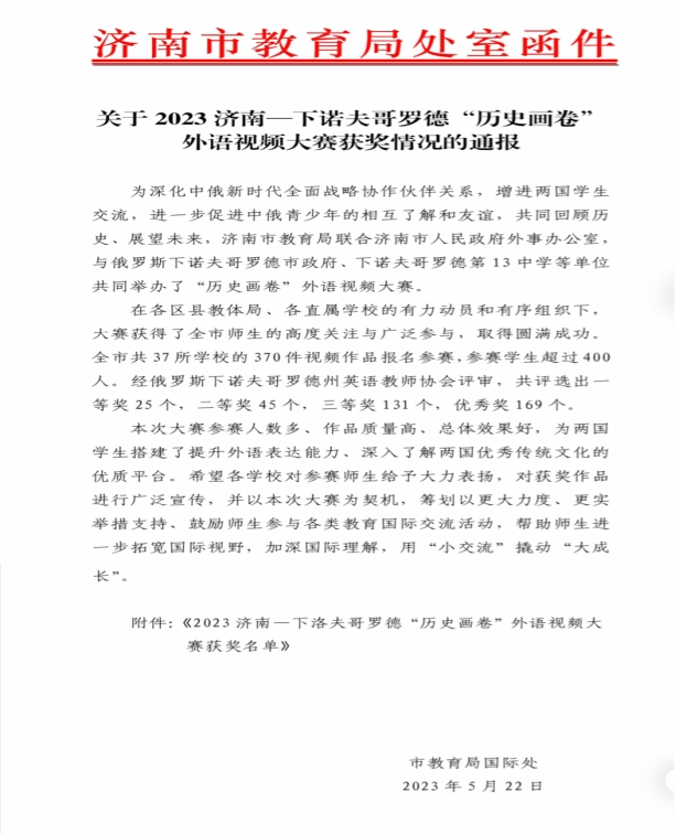 近日, 365英国上市网站官网人文学院学子在“2023济南—下诺夫哥罗德”“历史画卷”外语视频大赛中,荣获一、二、三等奖的佳绩!极大地鼓舞了学生用外语视频展示和中外友好关系往来的热情。