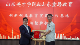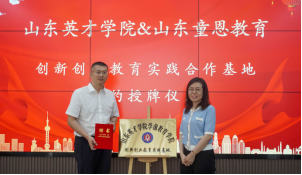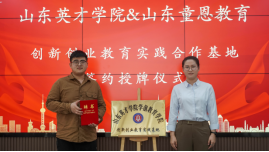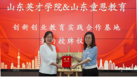 贾红梅院长代表我院与山东童恩教育科技有限公司总经理付立涛共同揭牌,并向山东童恩教育相关领导颁发创新创业校外指导教师聘书。