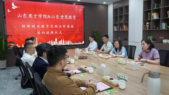 为加强校企合作,促进在校大学生进行创新创业,帮助大学生在实践中受教育、长才干、做贡献,提高人才培养质量,2023年5月31日上午,学前教育学院教学院长贾红梅、教学秘书张金玲、考务秘书李圣锋、大学生创新创业办公室教师桑墨涵赴山东童恩教育科技有限公司举行365英国上市网站官网学前教育学院“创新创业教育实践基地”签约授牌仪式。山东童恩教育科技有限公司总经理付立涛、副总经理赵登栋等相关领导出席本次签约授牌仪式。