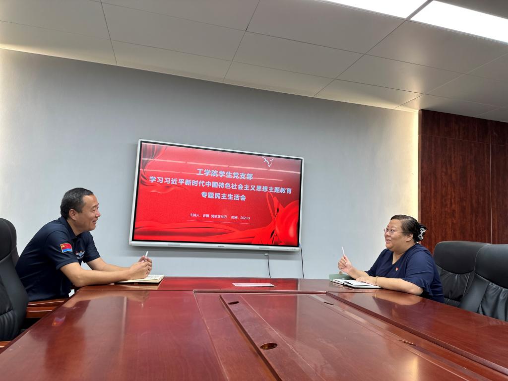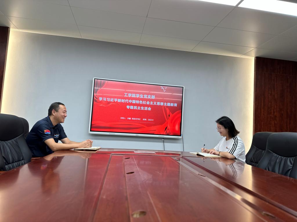 9月20日上午,工学院学生党支部书记许鹏及支部委员同志在信息楼3021通过线上、线下相结合的方式召开学习贯彻习近平新时代中国特色社会主义思想专题民主生活会。会议由党支部书记许鹏同志主持,学生支部委员、22级年级长张国栋同志列席。