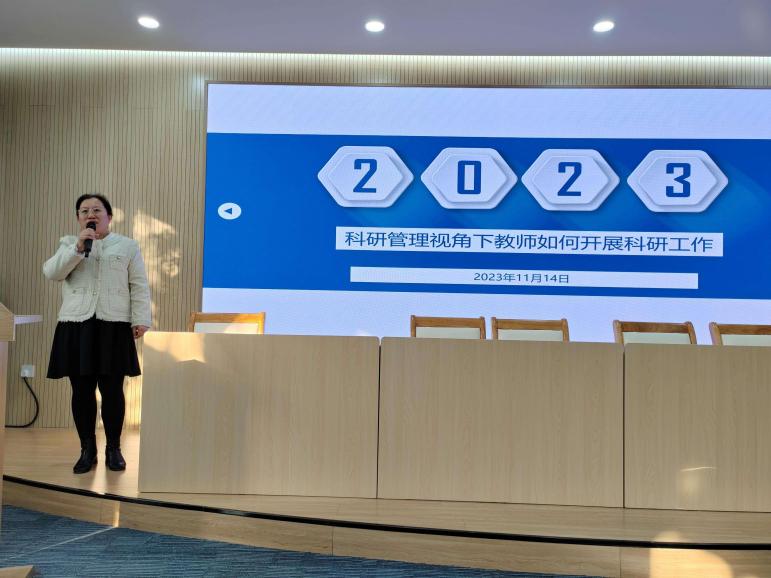 朱美处长以“解读科研政策”为主线,从科研管理制度解析、科研进展现状、青年教师指导三个维度展开培训。她详细讲解了教师科研工作量和科研奖励的计算、科研进度的跟进以及科研经费的管理内容,并重点强调了科研诚信的建设,致力于形成良好的科研风气。随后,朱美处长向与会教师介绍了近几年学校的科研进展情况,勉励大家在学校支持、领导重视的背景下积极致力科研、投身科研。