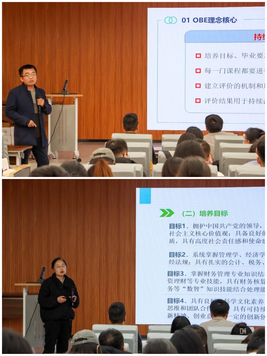 研讨会上,赵坤院长立足审核评估政策和要求,基于“产出导向”育人育才人才培养体系开展集中研讨。各专业教师代表针对所在专业的本科人才培养情况展开汇报。市场营销专业负责人魏书峰老师介绍了市场营销专业的专业特点、特色方向、师资结构、科研成绩等情况,并基于OBE理念对人才培养方案进行了细致讲解。财务管理专业负责人杨虹伟老师介绍了财务管理专业的专业定位、培养目标和专业建设成效,强调要提高专业建设内涵,加强协同育人平台建设。财务管理系段革花老师以《基础会计》为例,详细解读了该课程的教学大纲和教学设计。