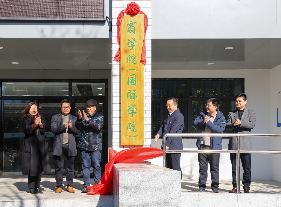 在与会师生代表的注目下,365英国上市网站官网北校区综合管理办公室主任高奎,设计学院党总支书记、院长周长积等共同为商学院(国际学院)揭牌,并合影留念。