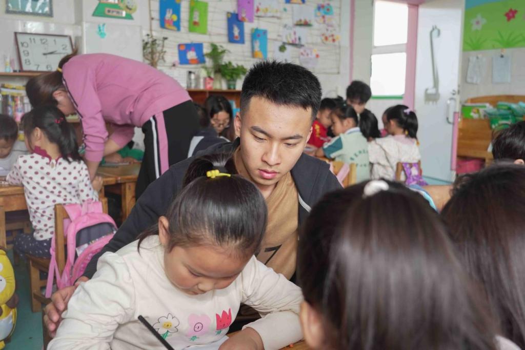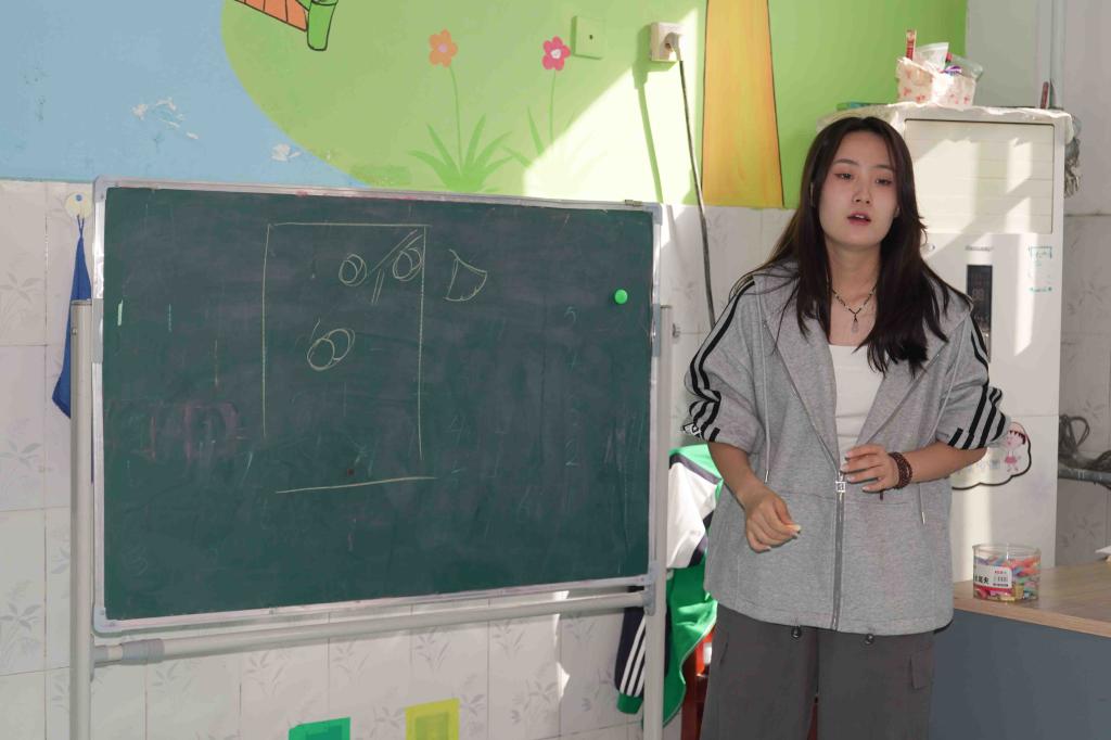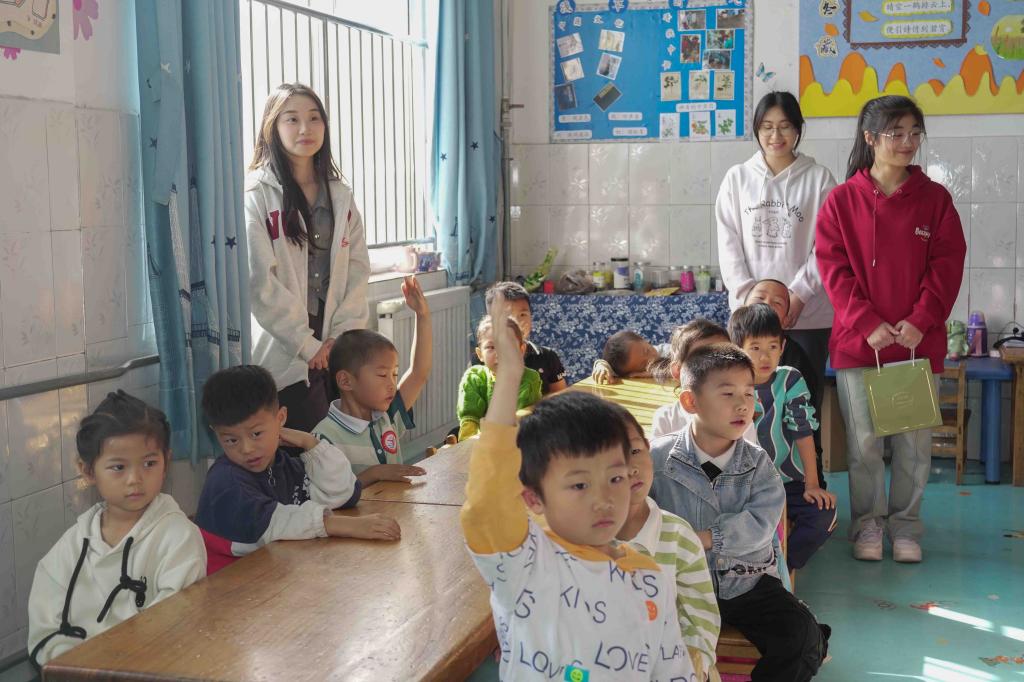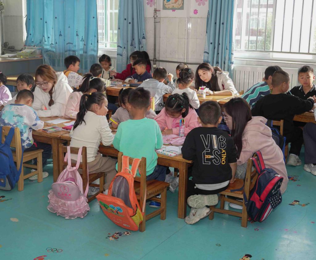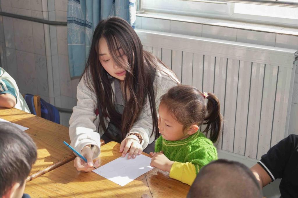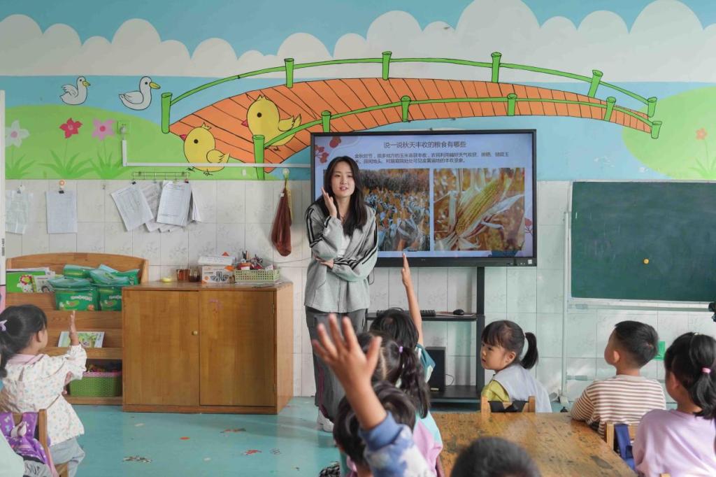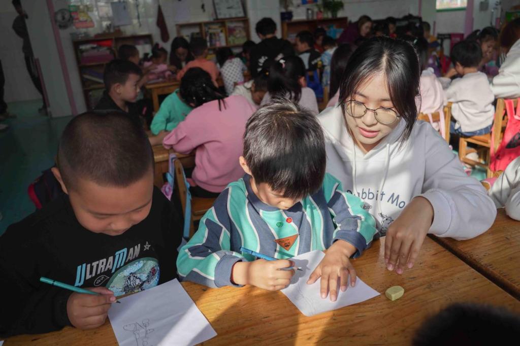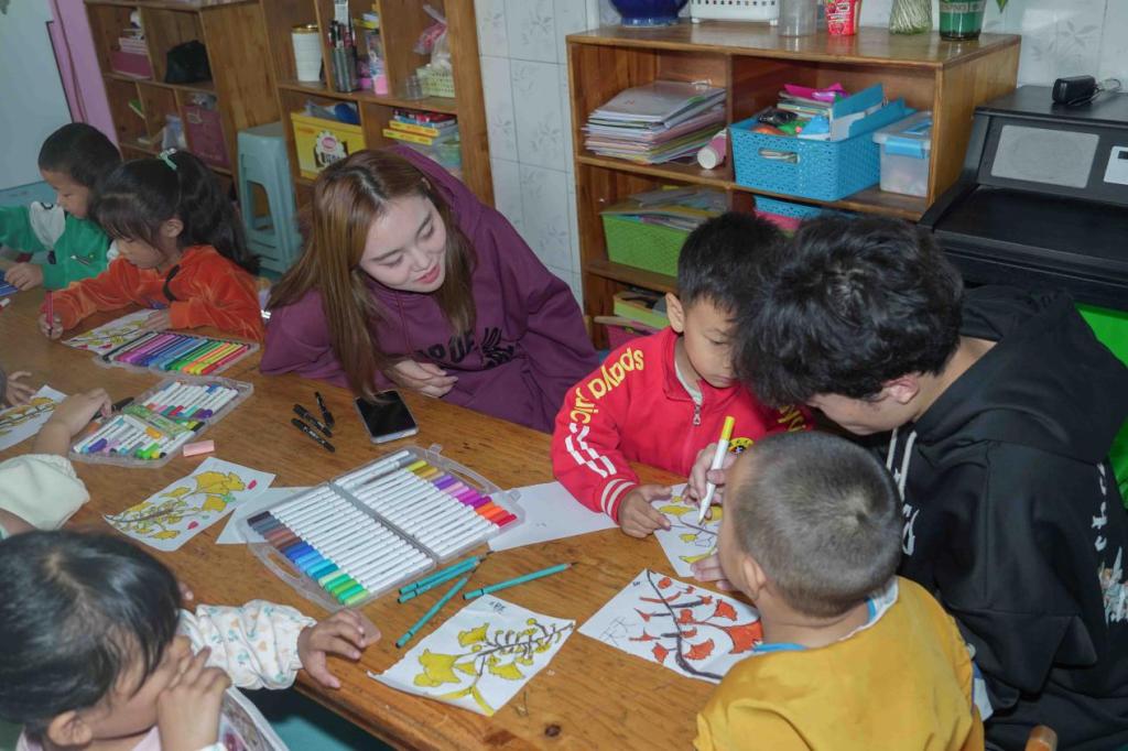 阵阵秋风吹落了红的叶、黄的叶,吹动了妈妈的裙角,吹来了水果的甜香。秋天蕴含了广阔的幻想和探索空间,志愿者们通过播放短片、教授绘画的形式,开展“秋叶之韵”为主题的教学活动,引导孩子们感受、发现和欣赏大自然中美的事物。