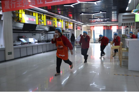 演练开始前,由北校区安全管理负责人韩长江给全体参训人员进行消防知识培训,对餐厅、员工宿舍常见的安全隐患,疏散逃生注意事项,消防事故产生的原因以及灭火器的分类、使用方法进行了详细讲解。随后,对本次演练过程和人员分工进行了部署,要求全体人员明确任务后依次开展快速报警、断气断电、人员疏散等过程演练。