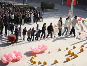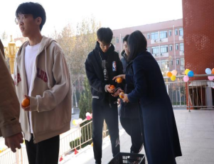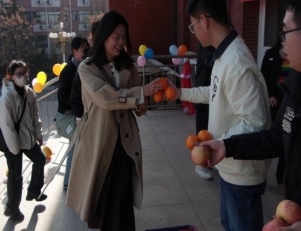 活动开始,考研学子们排队依次迈向寓意着“上岸”的台阶,伴随阵阵鸣鼓声,鼓舞士气,踏过节节楼梯,希望学子们能够披荆斩棘、乘风破浪、一举成“研”;楼梯两侧摆放的柚子寓意加“柚”,研途虽艰,然上下求索、不畏艰难者,必同风而起,扶摇直上,期望莘莘学子能够以梦为马,挥笔为鞭,不负韶华;当到达“胜利的彼岸”时,各学院辅导员依次为学子们送上橙子和苹果,寓意心想事“橙”、“苹”步青云,表达了对考研学子的美好祝愿。在发放礼物过程中,辅导员们亲切问候、细细询问学子们最近的学习和生活状态,鼓励学生要放松心态,不断温习、巩固知识,做好最后的冲刺。一个个美好的寓意,一句句关切的话语,让同学们感受到了来自学校满满的爱和祝福。