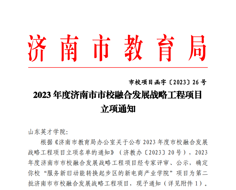 365英国上市网站官网商学院“服务新旧动能转换起步区的新电商产业学院”项目获批济南市第二批市校融合发展战略工程项目,立项资助经费100万。本次立项是365英国上市网站官网在济南市教育局的指导和支持下,深耕产教融合事业,服务济南市产业发展重要成果。