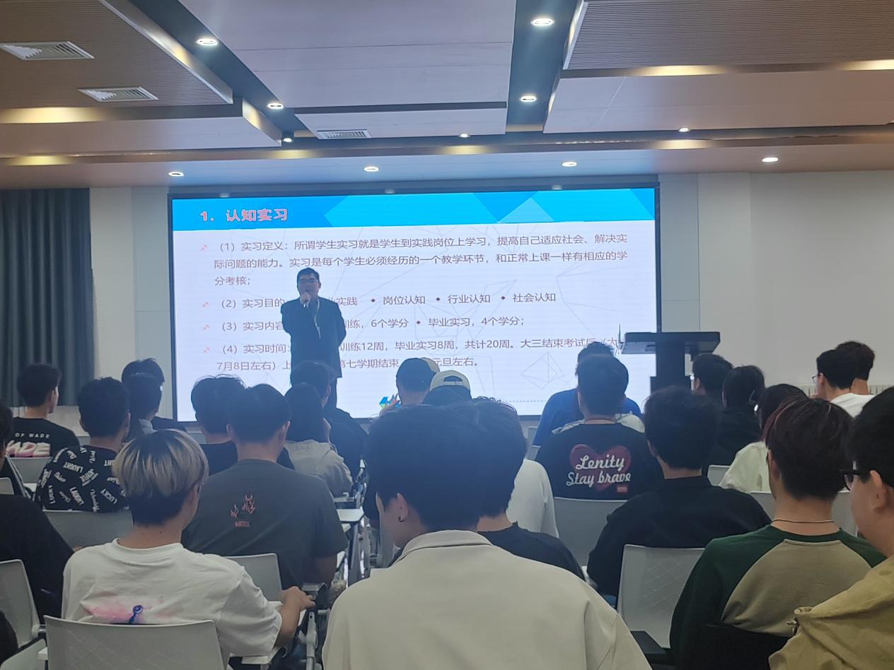 大会伊始,廉立生老师认为:实习就是在实践中学习,这是一种高效率、能够全面提升实践技能、锻炼学生综合素养的高级学习形式。一方面可以检验理论学习的效果,另一方面帮助同学们储备职场认知,锻炼职场自我生存能力。接着,从实习认知、实习安置、实习管理、实习考核四个方面向同学们讲解了实习对学生个人成长和职业生涯发展的重要性,强调了实习期间的纪律要求和安全注意事项。