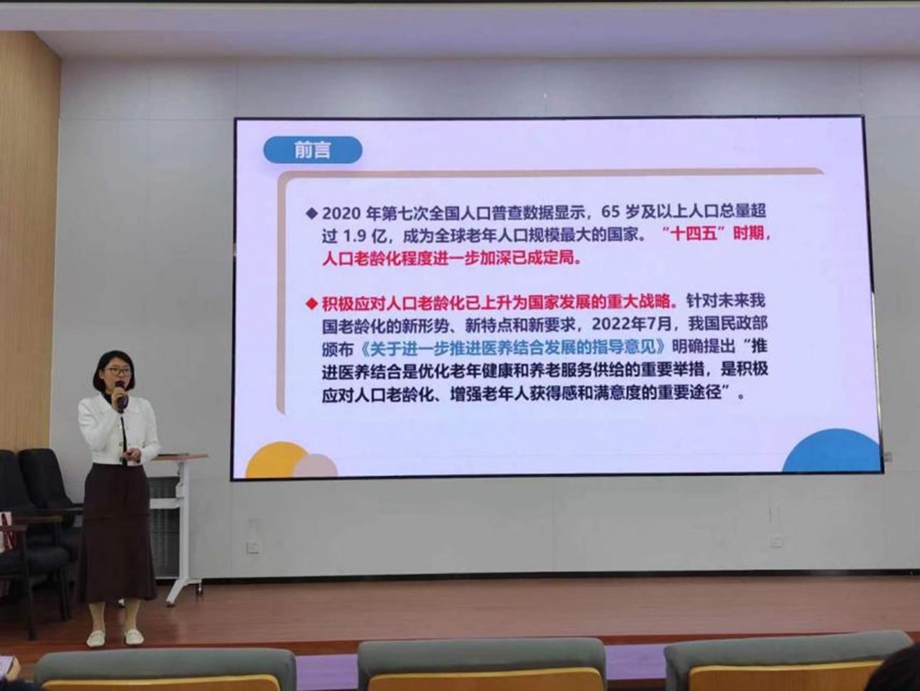 徐莉副教授结合具体的研究成果和实际案例,详细讲解了医养结合新型养老模式的相关知识,包括其概念、优势、当前存在的挑战以及未来的发展趋势等。这一研究课题致力于探索养老模式的新路径,以有效应对养老难题,并将医养结合模式转化为教育资源,从而推动其广泛应用。