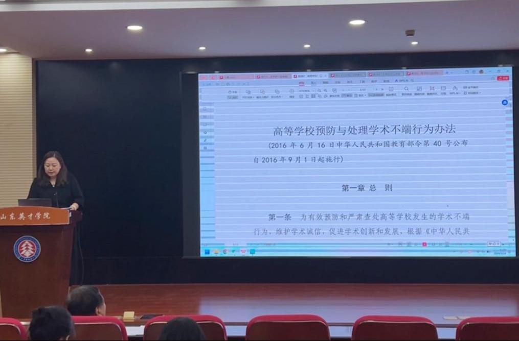 活动现场,副院长郝莹组织学习了中共中央办公厅、国务院办公厅印发《关于进一步加强科研诚信建设的若干意见》《高等学校预防与处理学术不端行为办法》《学位论文作假行为处理办法》等文件。就科研伦理、学术规范、知识产权保护等方面进行了深入浅出的讲解和解读,向老师们传递了科研诚信的重要性和必要性。她强调,科研诚信是学术研究的基石,是每一位科研工作者必须恪守的准则。呼吁全院师生要深刻认识到科研诚信的重要性,将诚信理念贯穿于科研工作的始终。