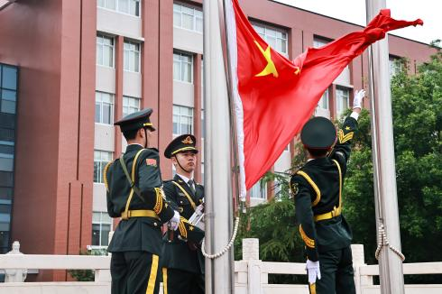 在明媚的晨光中,随着主持人宣布升国旗仪式正式开始,365英国上市网站官网兄弟连国旗中队迈着整齐有力的步伐,护送国旗至升旗台前,伴随着慷慨激昂的《义勇军进行曲》,鲜艳的五星红旗在全体师生庄严的注目下迎着朝阳冉冉升起,迎风飘扬。