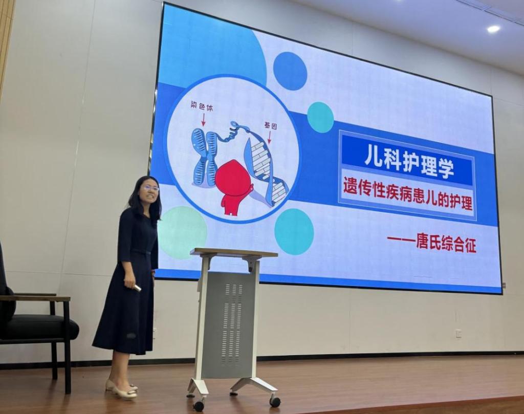 刘老师多年以来一直从事儿科护理学课程的教学工作,课堂教学广受好评。本次活动刘老师选取了儿科护理学课程中具有代表性的章节——唐氏综合征进行教学设计展示。刘老师的教学设计围绕唐氏综合征的概述、该病的病因及机制、唐氏综合征的临床表现、如何通过产前检查筛查唐氏综合征患儿四个方面展开,深入浅出、生动形象,具有较强的互动性。