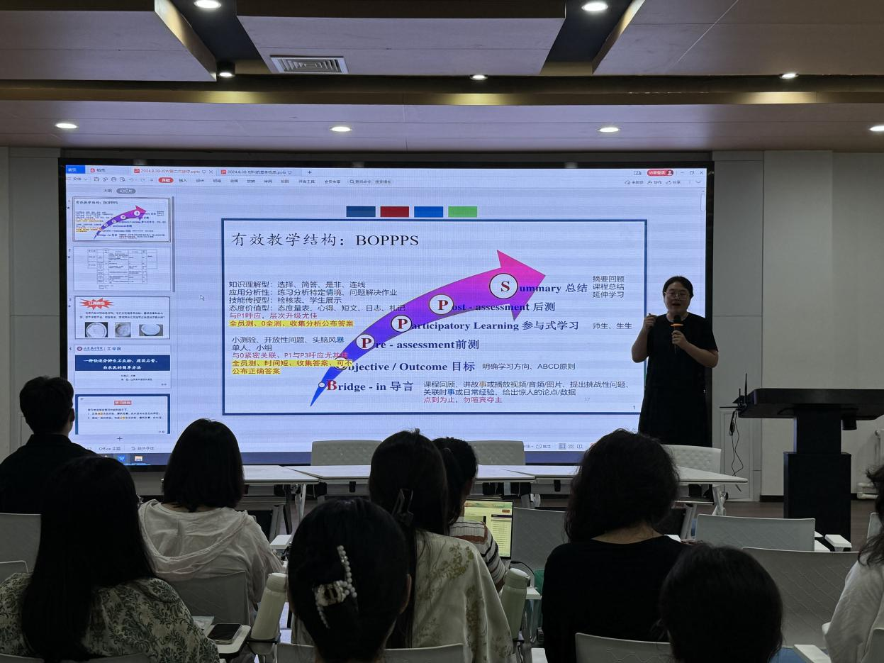 8月30日上午,刘晶老师结合自己的教学案例详细讲解了BOPPPS有效教学结构在实际教学中的应用,鼓励青年教师将BOPPPS有效教学结构应用到课堂教学改革、教学比赛和项目申报等各种教学研究中去;下午,每个专业群选出一位青年教师进行了限时10分钟BOPPPS教学结构微课实战演练,其他不同专业的参训教师作为学习者,在场认真学习、交流、点评和建议。