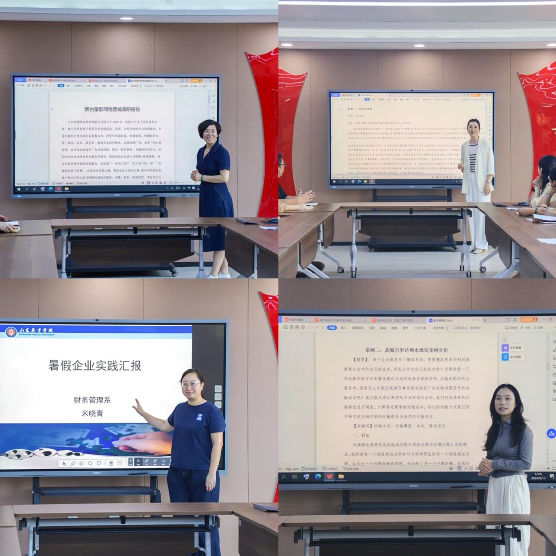 各专业代表老师分享了在实践锻炼中的心得体会,财务管理系的米晓青老师汇报了自己在企业财务管理部门的实践经历,通过参与企业的财务分析、预算编制和成本控制等工作让她更加清晰地认识到财务管理理论与实践之间的差距。米老师也表示通过专业实践,会把实践中的案例和经验带回课堂,使教学内容更加生动、具体。徐文武老师分享了自己在企业的实践经历,她表示实践锻炼让她对管理有了更全面的认识,学会了如何运用管理理论解决复杂问题。国际商务系的隋新老师、工商管理系的方志伟老师也分别分享了她们在企业的实践经历。她们表示会把实践调研的最新成果和案例引入课堂,激发学生的学习兴趣和创造力。培养学生的管理思维和实践能力。