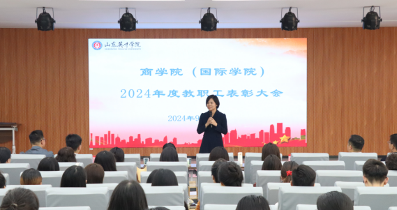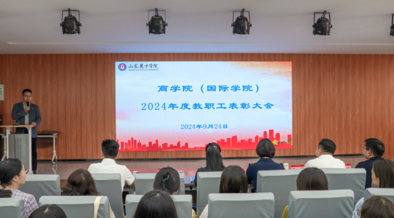 为表彰在本年度学院发展和教育教学等方面做出突出贡献的教职工,商学院(国际学院)于9月24日在学术报告厅隆重举行了2024年度教职工表彰大会。学校副校长宋艳艳、副校长李晓玲、北校区综合办主任高奎、商学院党总支副书记徐宜慧、教学副院长殷永生及全体教职工出席了此次会议,会议由商学院(国际学院)党总支书记、院长赵坤主持。