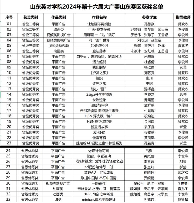 大广赛山东赛区省赛成绩,今年大广赛参赛人数众多,竞争激烈,设计学院学子在老师们的精心指导下,取得了优秀的成绩,共获得大广赛省赛等级奖33项,其中二等奖2项、三等奖4项、优秀奖27项。