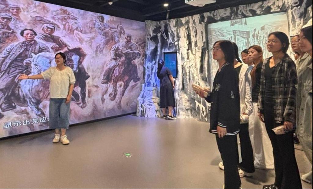 党建与思政教育基地以“四史”教育为主线,围绕百年党史脉络打造四大主题展区,通过标志性历史事件与成就的生动呈现,构建起立体化红色教育平台。在“新民主主义革命时期”展区,师生通过文献资料、影像记录等重温中国共产党艰苦卓绝的革命历程;于“长征专题展区”,司一丹老师结合长征路线图与纪录片,讲述了“强渡大渡河”“飞夺泸定桥”等经典战役。她强调:“长征不仅是战略转移,更是中国共产党人精神信仰的伟大远征。”在场学生沉浸于历史情境中,深刻体悟到革命先辈的坚韧与信仰。