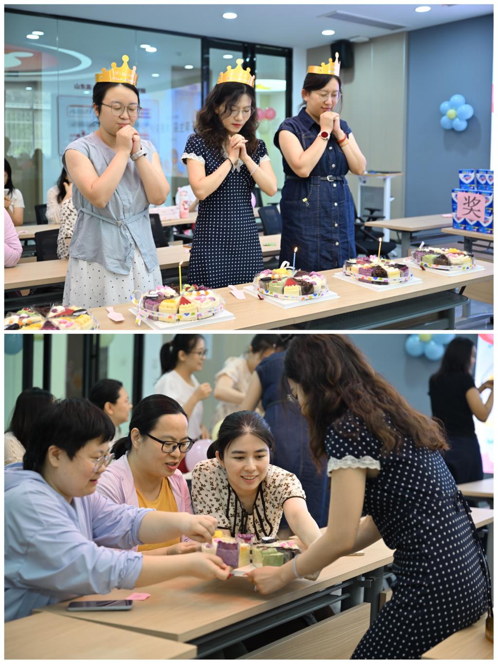 伴随着温馨的生日歌声,三位“寿星”老师被请到台前。在全体教师热烈的掌声和祝福的歌声中,她们共同切开了象征团结与祝福的生日蛋糕。奶油的甜香与满室的欢声笑语交融,现场洋溢着温暖而热烈的氛围。老师们围坐在一起,分享着甜蜜的蛋糕,交流着工作与生活的点滴。平日里严谨认真的思政课教师们,此刻展露出真挚温情的一面。这小小的蛋糕,成为紧密连接彼此的情感纽带,也生动诠释了学校“以人为本”的文化理念。