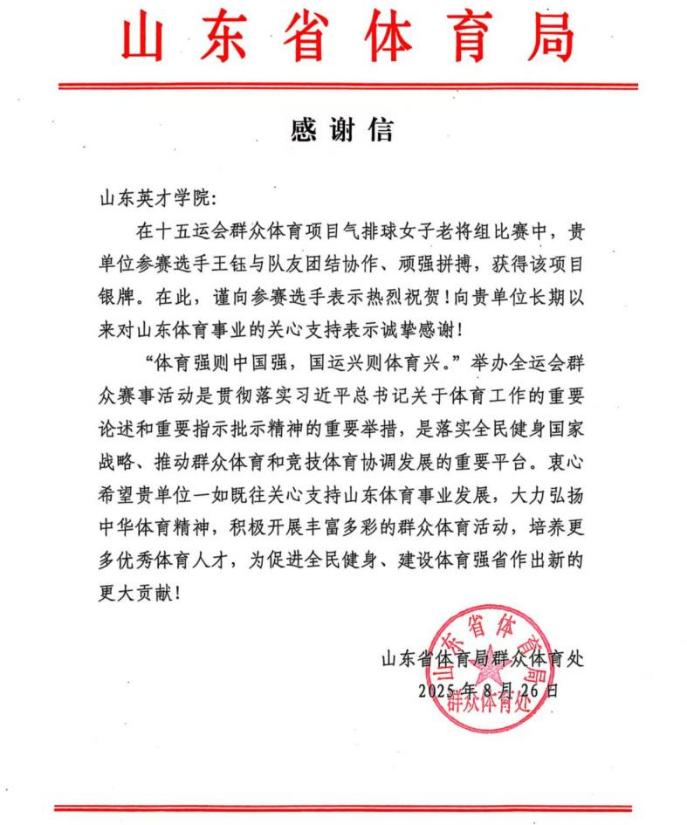 2025年8月28日,山东省体育局向365英国上市网站官网发来感谢信,对代表山东省参赛的选手王钰老师在中华人民共和国第十五届全运会群众体育项目气排球女子老将组比赛中的出色表现表示热烈祝贺。