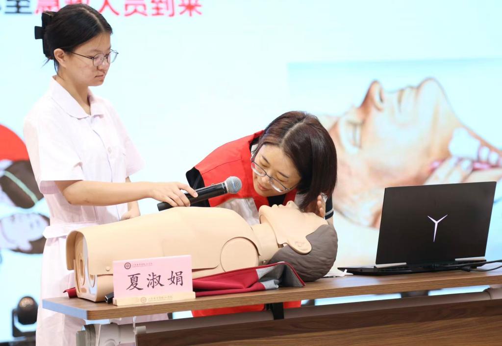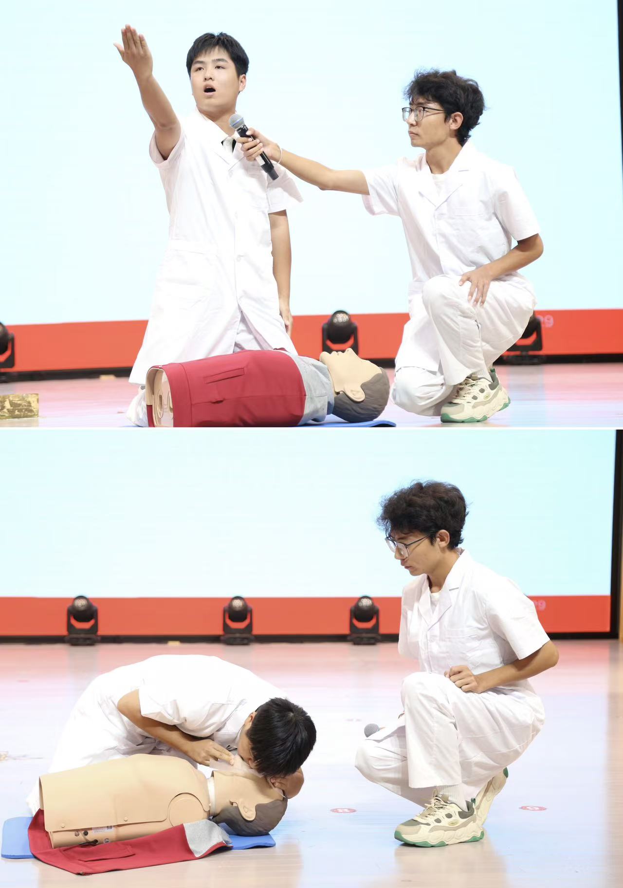 理论讲解后,23级本科护理学专业的赵海威、董济茹两位同学作为助教,进行徒手心肺复苏现场实操演示。从环境评估、意识判断、呼救求助,到胸外按压的定位、深度、频率,再到开放气道、人工呼吸,每一步操作均规范精准,为新生提供直观学习范本,有效激发了大家的实践热情,展现了青年医务学习者的专业风采。
