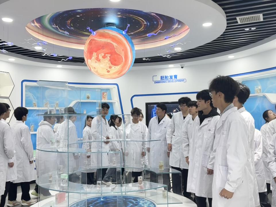 上午9时30分,生命科学馆正门缓缓开启。身着白袍的2025级新生代表整齐列队,在志愿者引导下依次入馆。同学们俯身观察“矢状切面”标本,凝神端详“胚胎标本”,步履轻缓,神情庄重。馆内全程保持“零扩音”模式,讲解员以耳语音量介绍标本结构及其临床意义。在持续5分钟的静默环节中,唯有模拟心跳监测仪的“滴——”声回响,全体师生以最深沉的静默,向为医学事业无私奉献的“无语良师”致以崇高敬意。