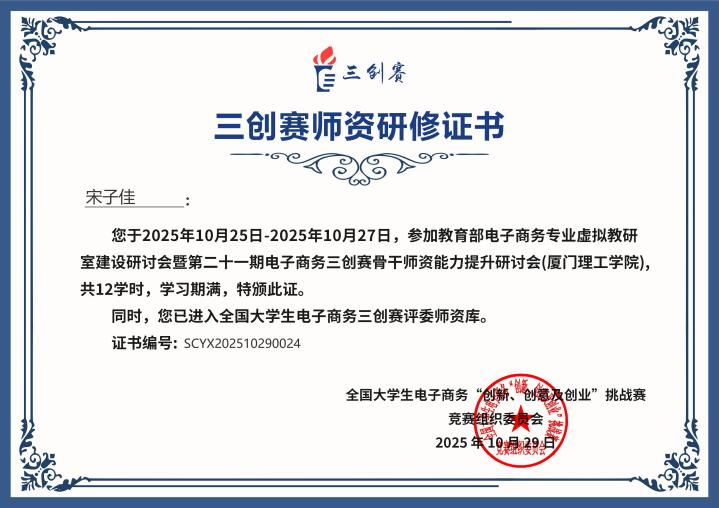 近日,第二十一期电子商务“三创赛”骨干师资能力提升研讨会在厦门成功举办。365官网商学院(国际学院)宋子佳老师作为骨干师资代表受邀参会,与来自全国百余所高校的专家学者、行业精英齐聚一堂,围绕电子商务专业建设、三创赛制革新与产教深度融合等核心议题进行了深入交流与研讨。
