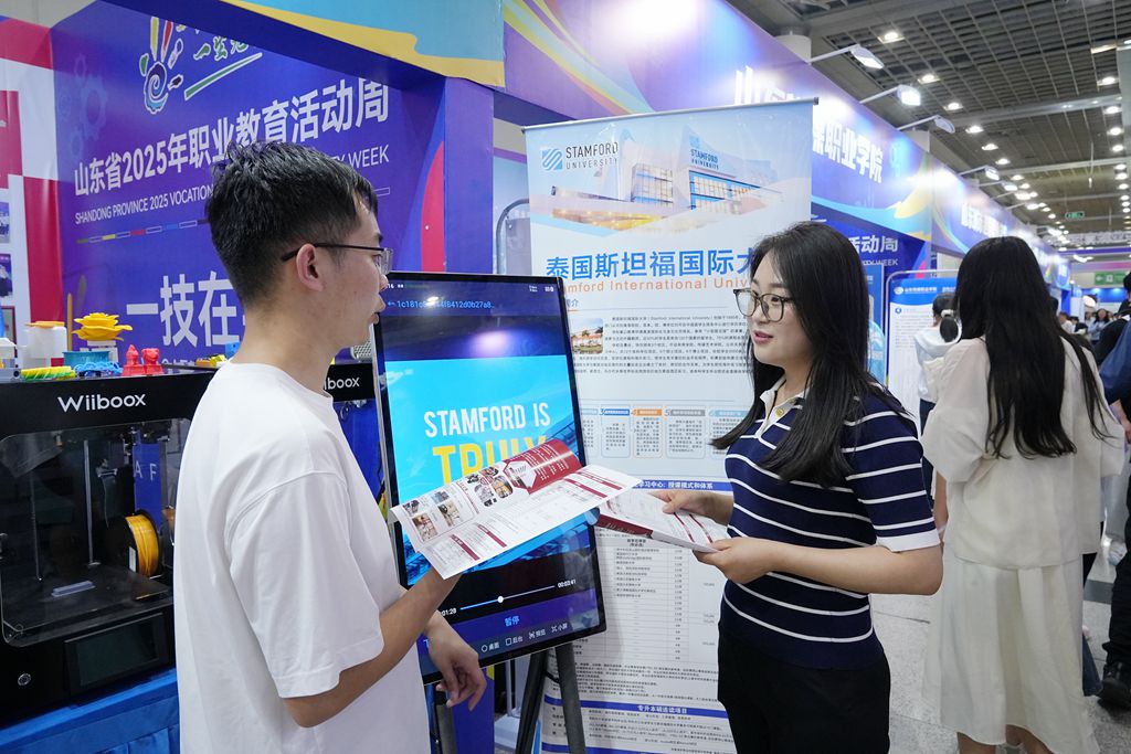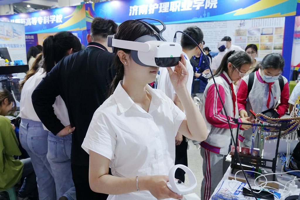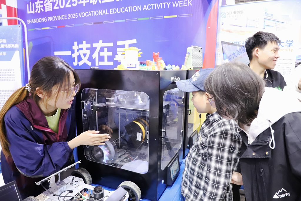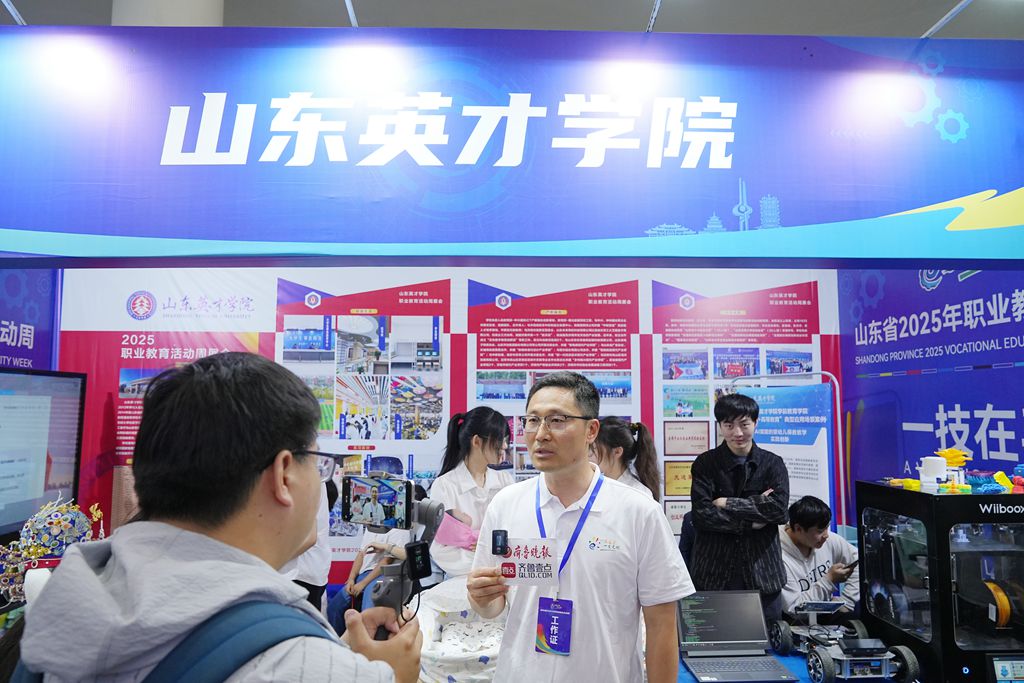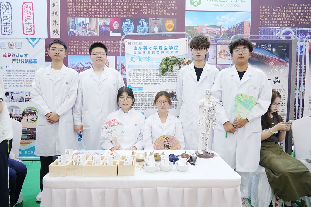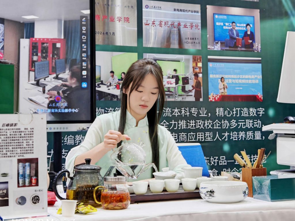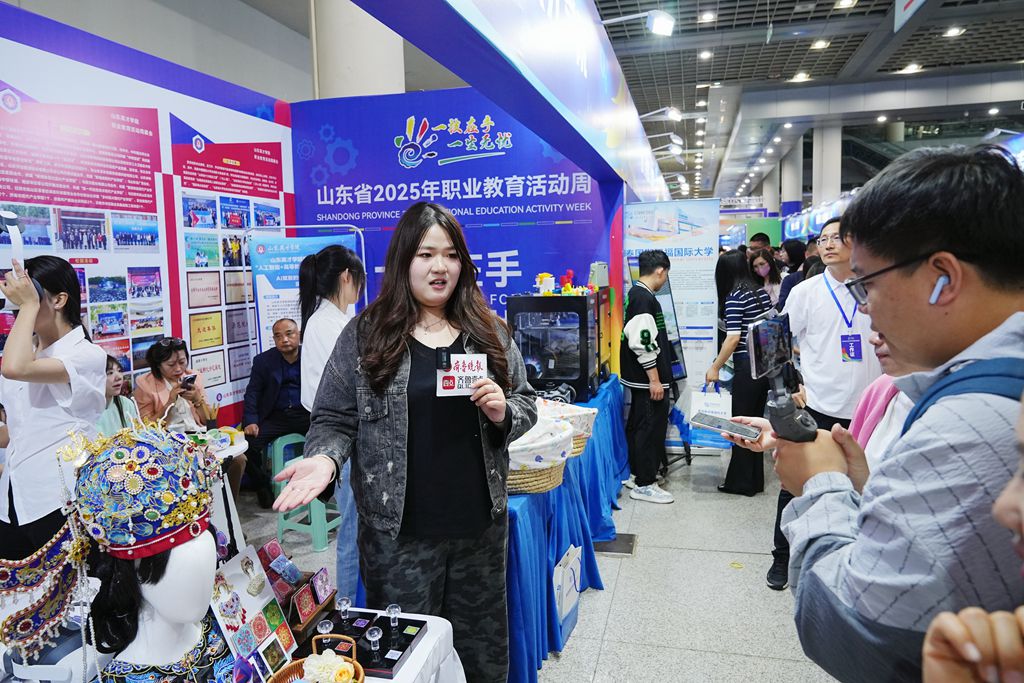 风采展区聚焦产教融合前沿,展示3D打印、智能驾驶、虚拟仿真娃娃及AR数字插画影像设计等项目,勾勒出学校深度服务地方、紧密对接产业的发展脉络。非遗展区,医学院“艾尚你”理疗馆的同学们以精心制作的香囊与现场展示的精湛推拿技艺,将传统中医文化的深厚底蕴娓娓道来。该项目成功立项国家级大学生创新创业项目等,为传承中医文化、培养康复技能人才作出积极贡献。在电商展区,一辆酷炫直播车成为众人瞩目的焦点,商学院以“数字赋能 智播乡村”为主题,电商产业学院的同学们通过直播带货的形式,将现代农业与数字经济紧密结合,邀请观众化身主播,共同推介“好品山东”产品,生动诠释职业教育服务乡村振兴的使命担当。
