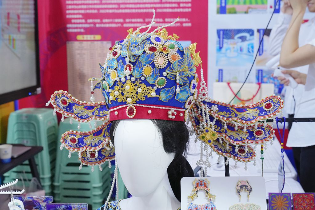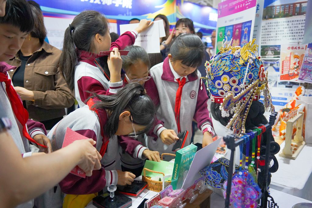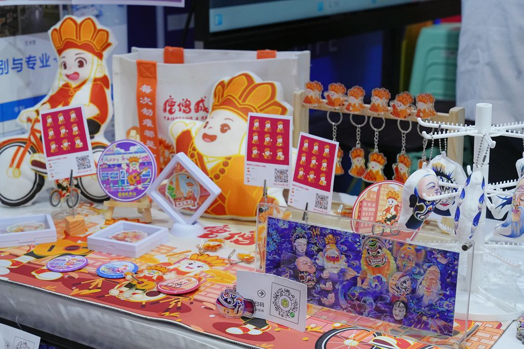设计学院学子魏如萱“云肩映钗韵”系列作品惊艳全场。她以《红楼梦》中“元春省亲”经典造型为灵感制作的纯手工凤冠,流光溢彩、精美绝伦,搭配以“金陵十二钗”为主题的云肩纹样,金丝银线间流转着传统文化的典雅韵味,引得观众频频发出“太美了”的赞叹,充分体现了英才学子对传统文化的深刻理解和创新传承。前来参观的研学学生纷纷驻足欣赏,用精美的传统纹样印章记录这一美好时刻。还有“偶说”漳州木偶头文创、“唐僧成长记”AI互动作品,通过扫码即可实现动态演绎与趣味表情包生成,真正让传统艺术照进现实,成为技能创造美好生活的生动写照。