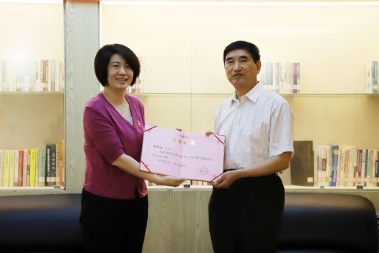 校长刘珊珊为梁振爱主任颁发捐赠证书
