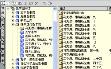 1.打开超星阅览器,点击“资源”耳朵,可以从左侧的“数字图书馆”站点中看到最新的图书分类。展开分类直到右侧书名窗口显示书名。