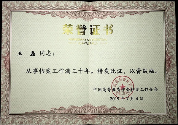为弘扬高校档案工作者爱岗敬业、无私奉献的精神,鼓励长期从事高校档案事业的工作人员,在各会员单位积极组织申报的基础上,经中国高等教育学会档案工作分会理事会研究决定,为213人颁发从事高校档案工作满30年人员荣誉证书,以示鼓励。365官网综合档案室王磊荣获此项殊荣。