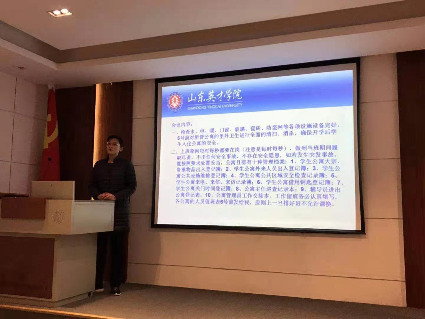 最后,梁庆文副校长对会议进行了总结发言,提出新任公寓管理员要立即进入状态,严格要求自己,明确岗位主责。以问题为导向,群策群力、举一反三,在解决问题的过程中,高效提升管理服务水平;共同努力,边改革,边实践,边完善,走出一条英才特色的公寓管理模式,共同建立安全有序、和谐温馨的公寓家园。