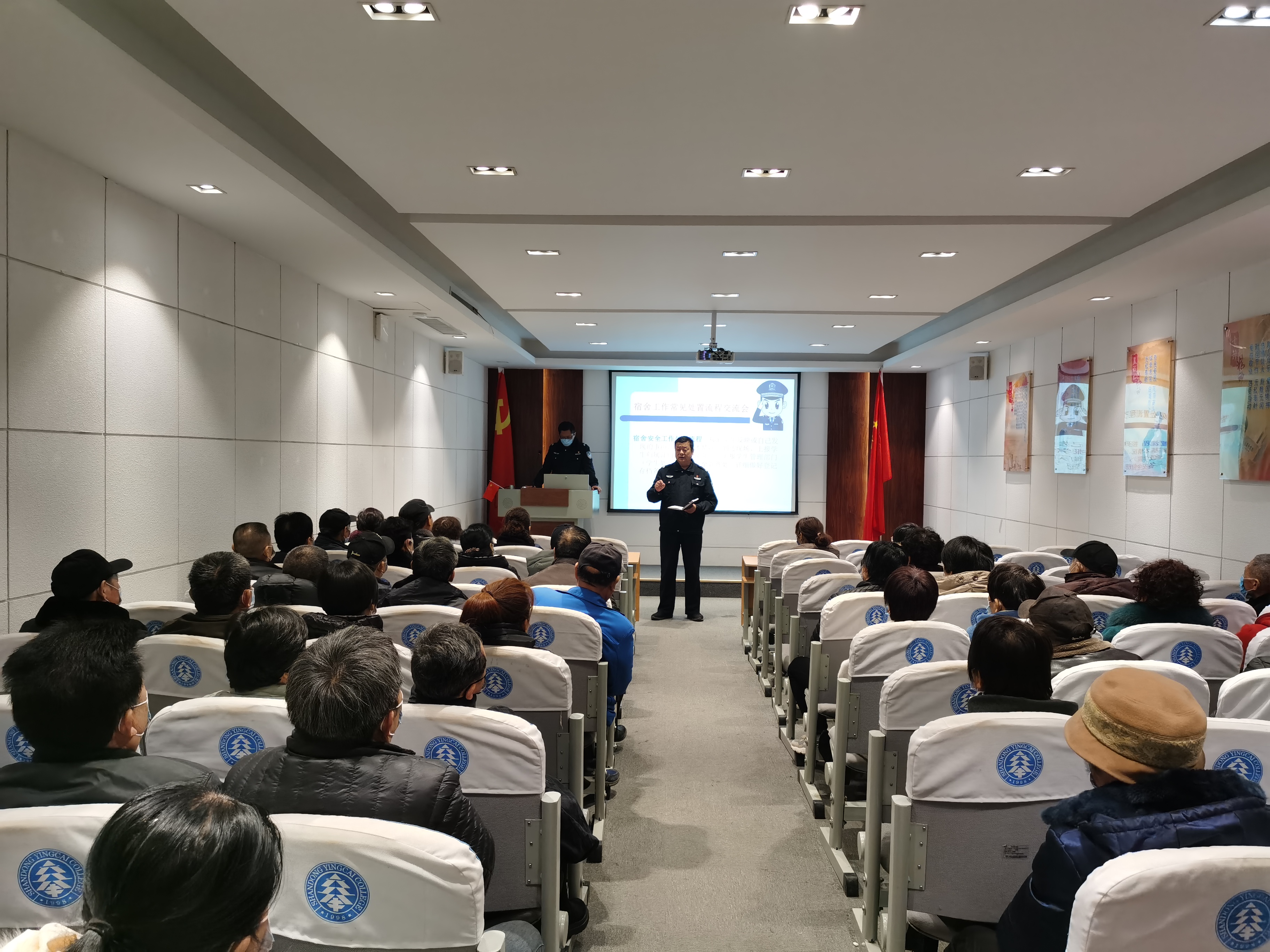 安全管理处韩长江主任、马贤省主任、杜飞老师、王鹏老师对管理员进行了公寓治安工作处置及消防安全知识培训,使管理员了解公寓存在的安全隐患,学会消防器材的使用及火灾处置流程等,为公寓住宿环境安全和秩序稳定提供保障。