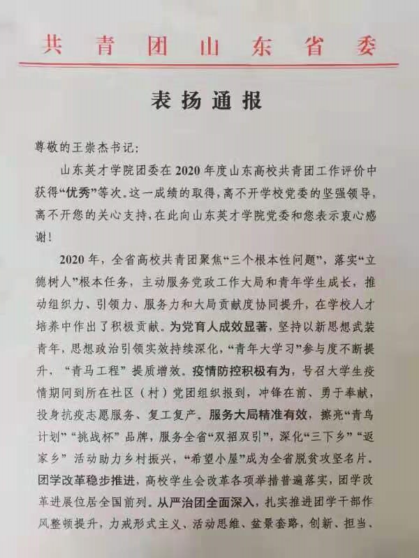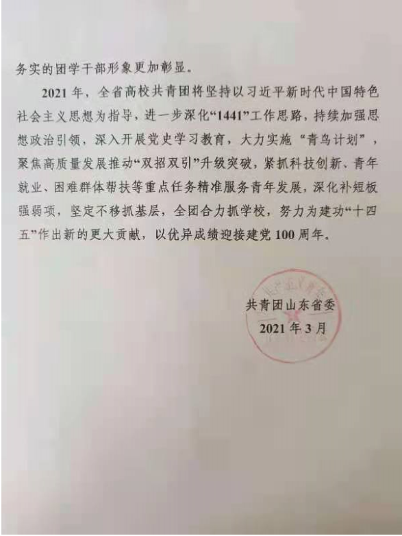 近日,365官网党委书记王崇杰收到团省委的表扬信,表扬365官网团委在2020年度山东高校共青团工作评价中荣获“优秀”等次。
