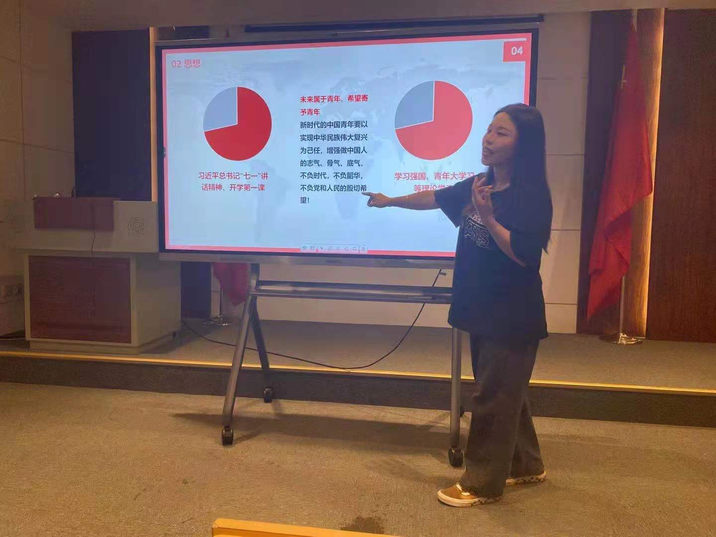 来自学前教育学院的康帆以当前实事热点为引,将当前热点与学生即将面临的新环境密切结合,提出实用建议,开展思政教育,整体气氛活泼,拉近与学生距离。
