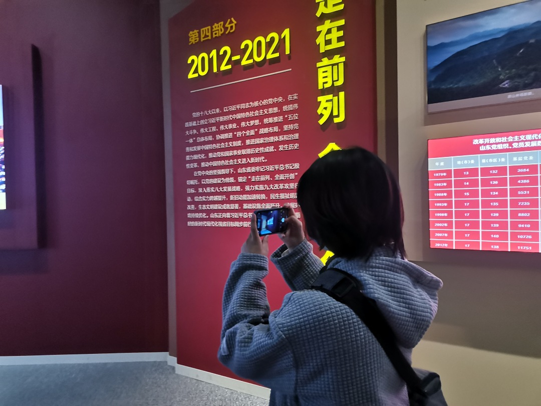 通过530余幅图片、210余件(套)文物实物、50余项500余条音视频及多媒体展项,集中展示中国共产党成立百年来特别是党的十八大以来,在党中央坚强领导下,山东党组织团结带领全省人民取得的历史性成就、发生的历史性变革,充分展示山东党组织在党的领导下的践行初心使命史、不懈奋斗史、自身建设史、政治锻造史。