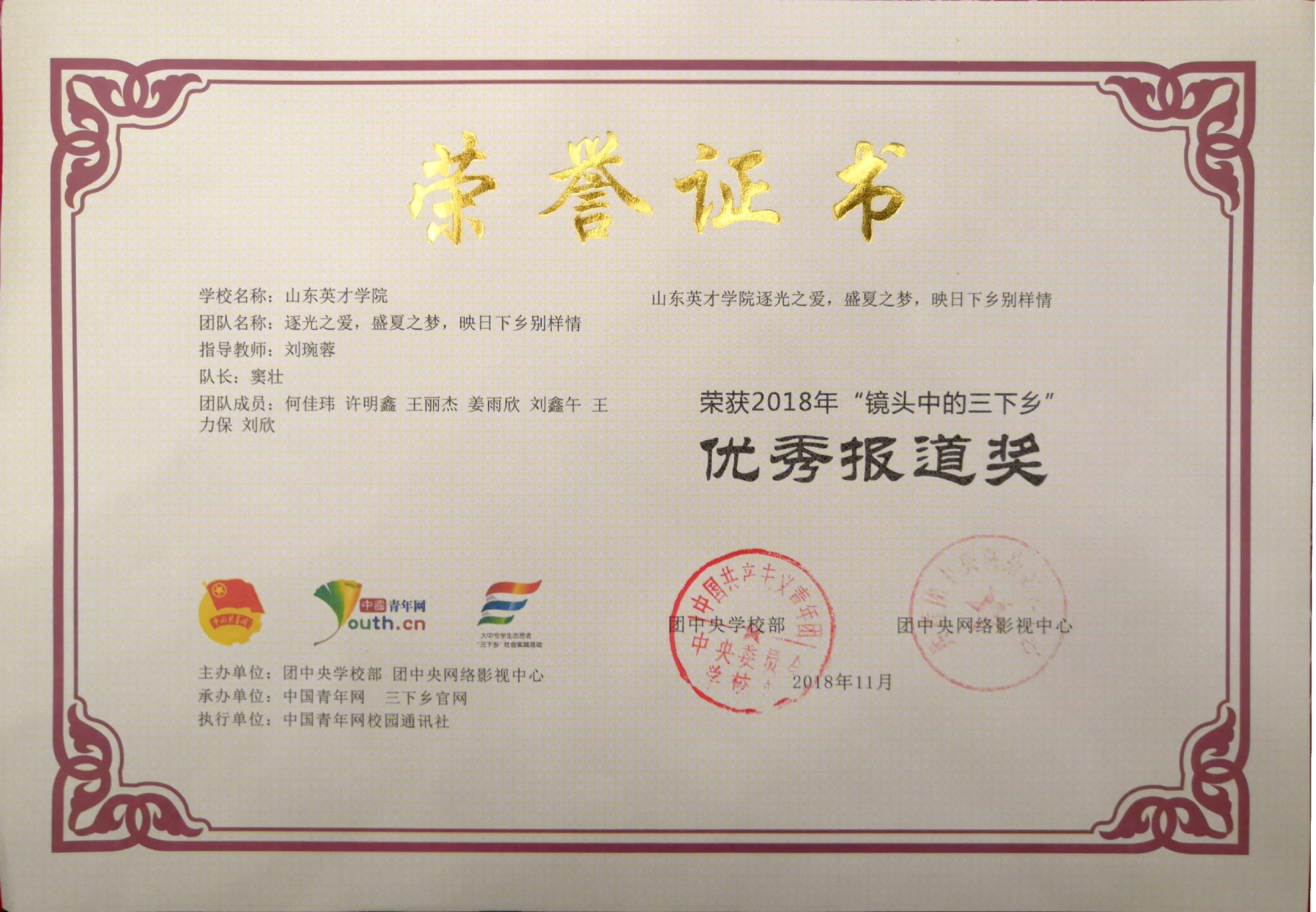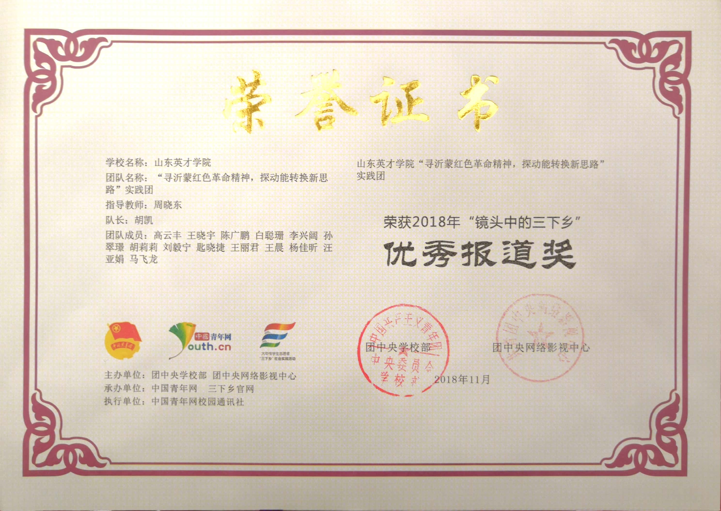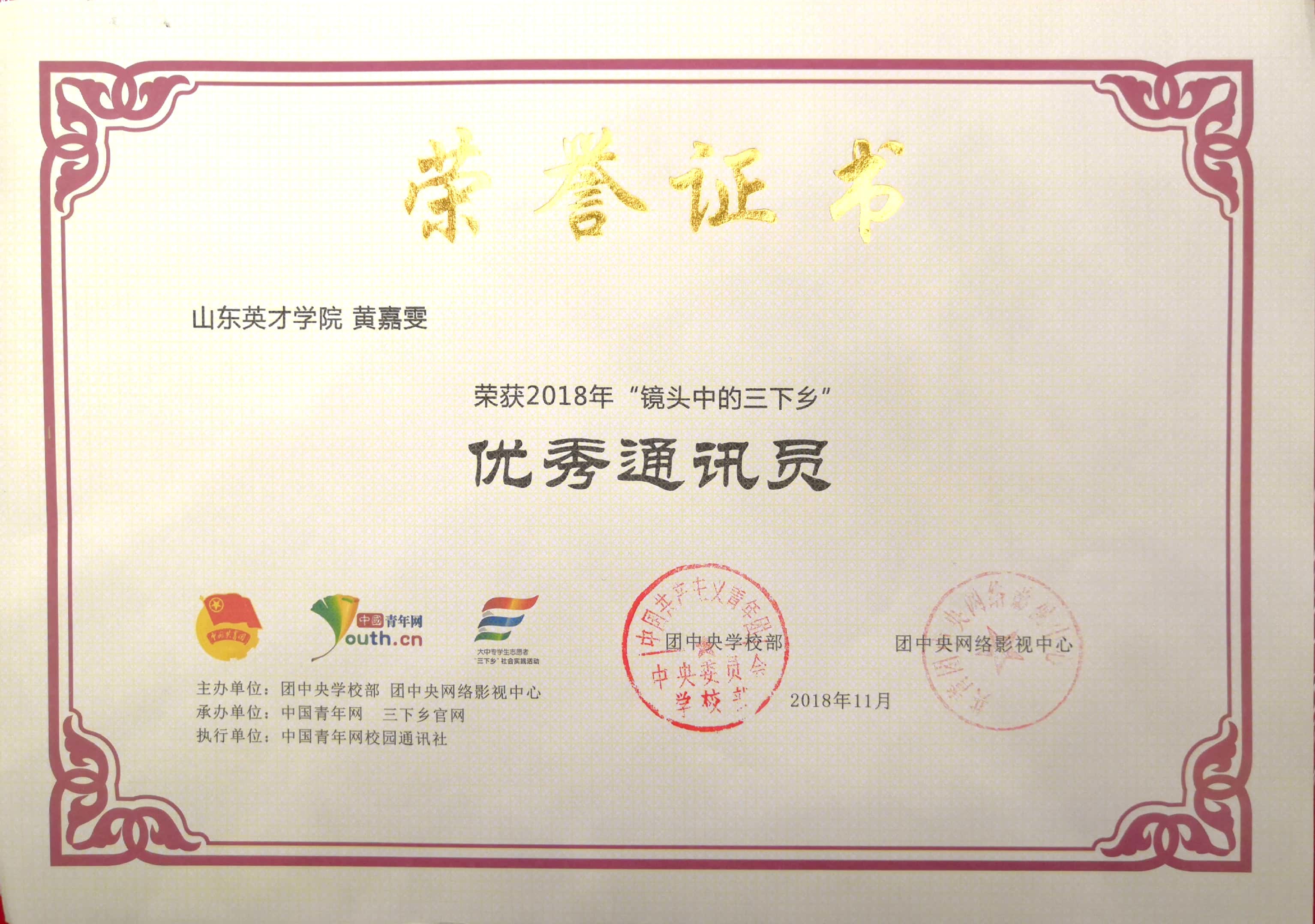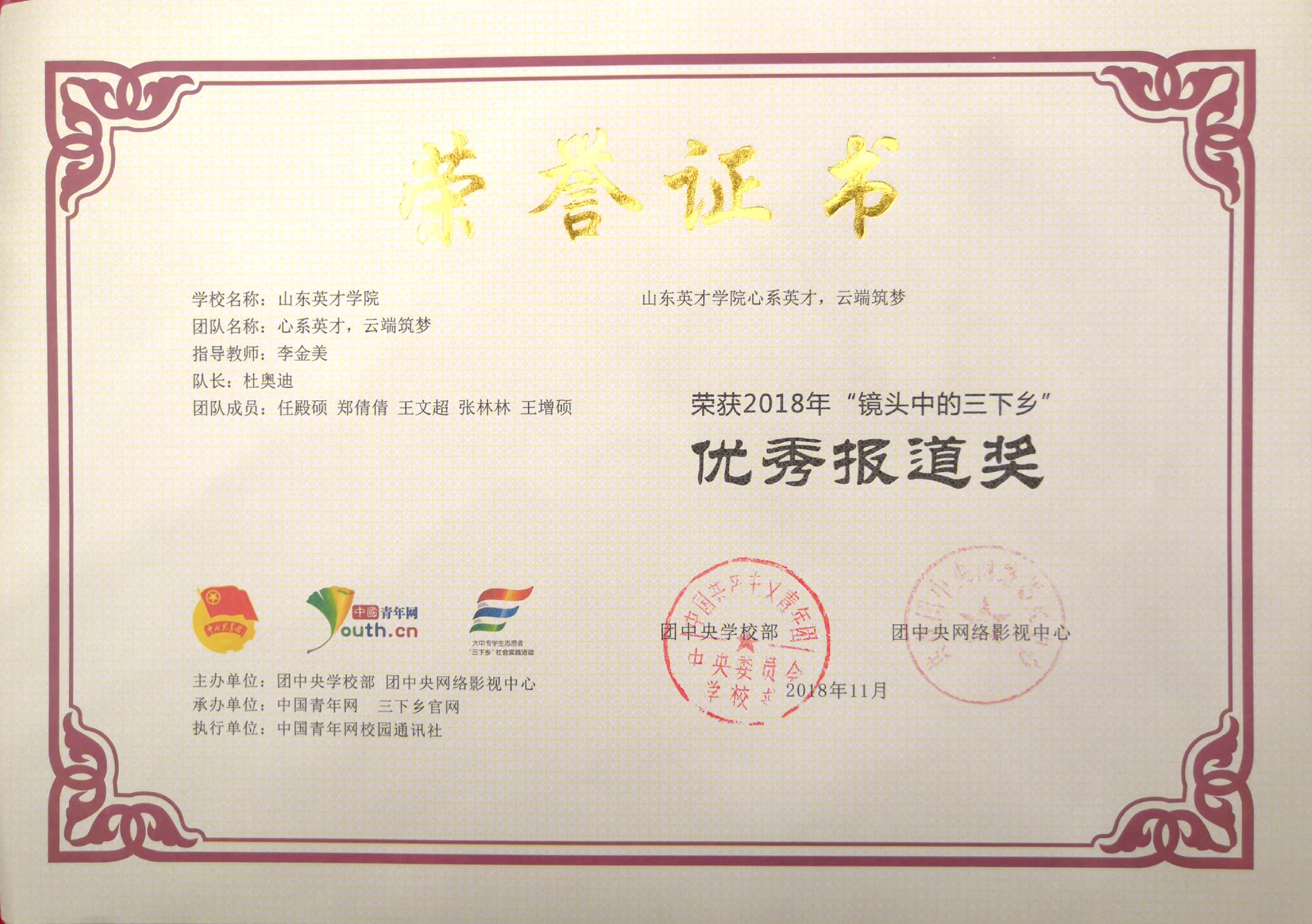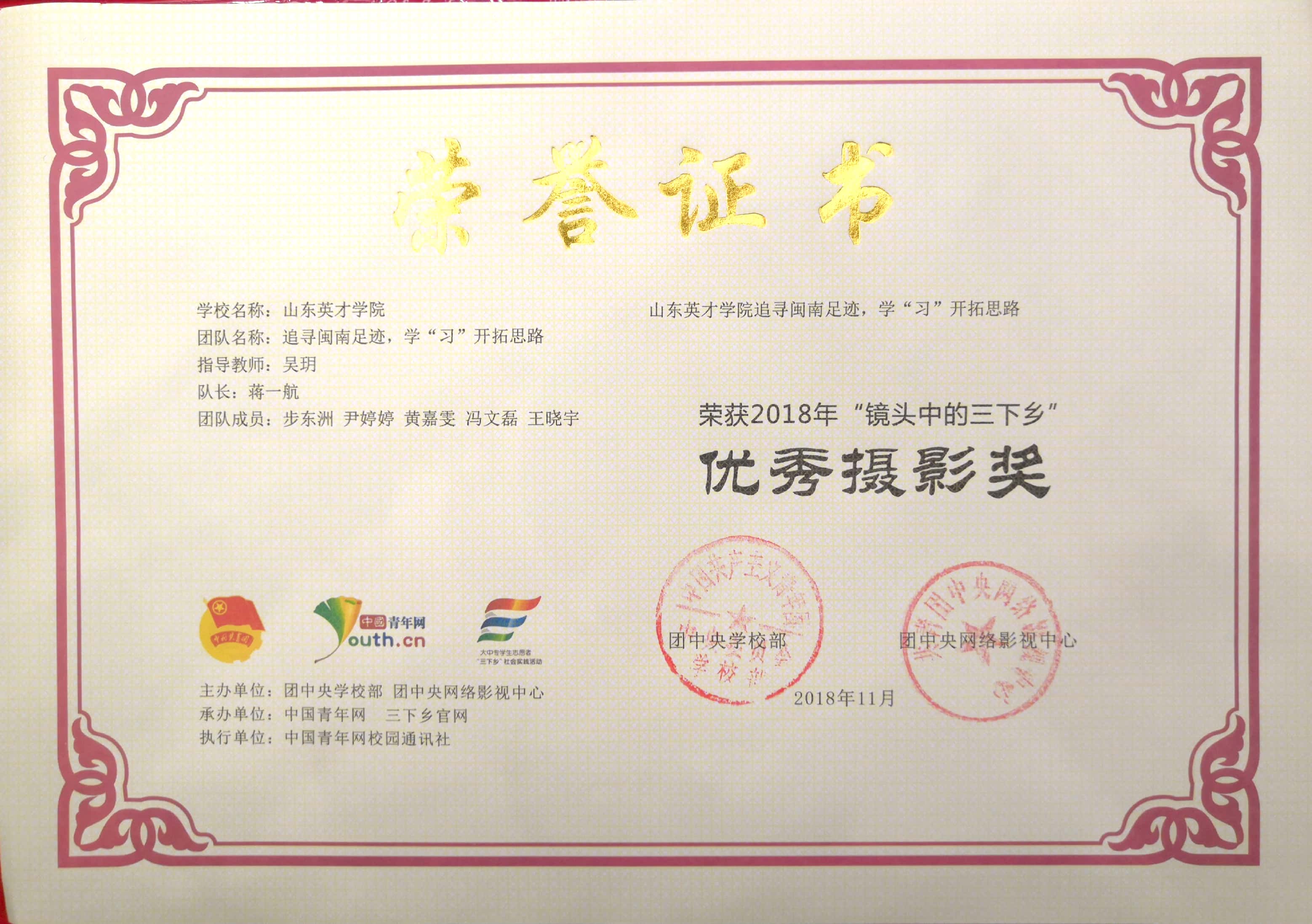 365官网在“镜头中的三下乡”评选活动中喜获佳绩,三大实践团队“寻沂蒙红色革命精神,探动能转换新思路”、“心系英才,云端筑梦”、“逐光之爱,盛夏之梦,映日下乡别样情”荣获“镜头中的三下乡”优秀报道奖“。“追寻闽南足迹,学‘习’开拓思路”荣获2018年“镜头中的三下乡”荣获“优秀摄影奖”,团队指导吴玥老师荣获“优秀指导老师”,团队成员黄嘉雯同学荣获“优秀通讯员”。