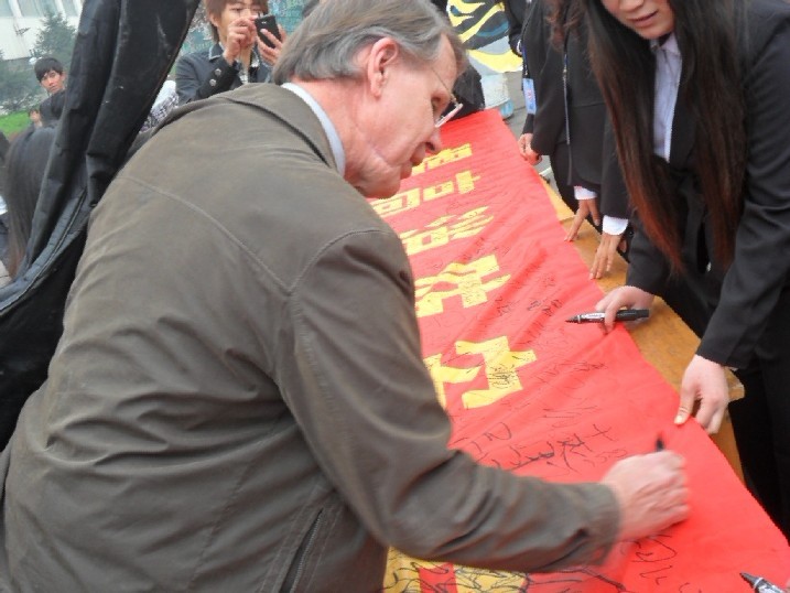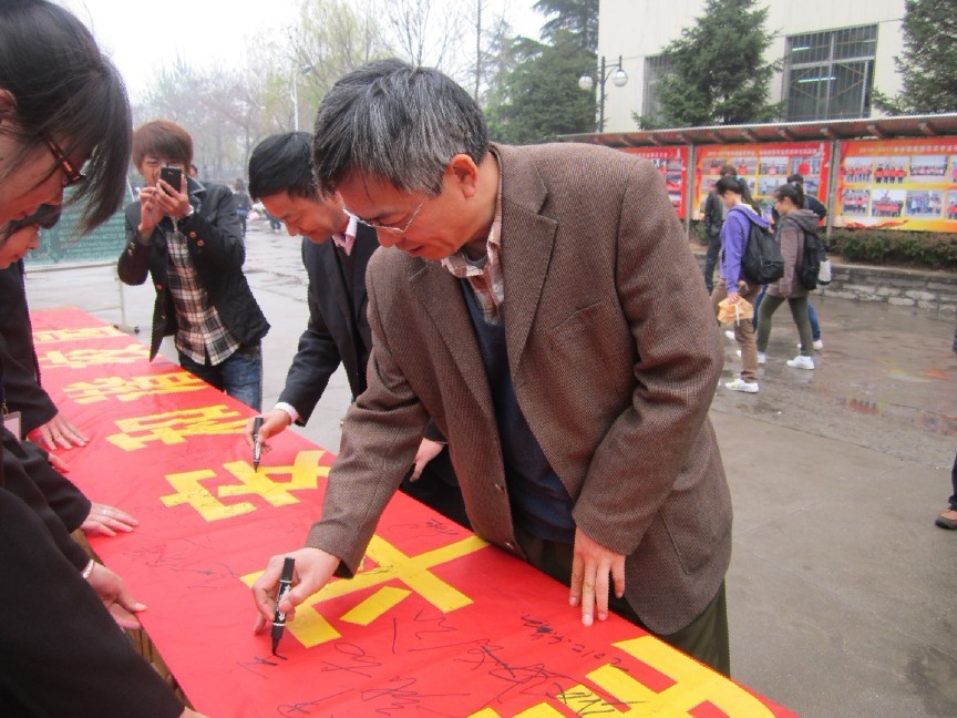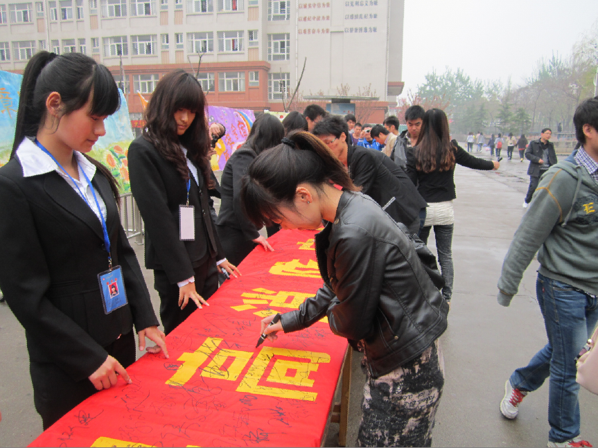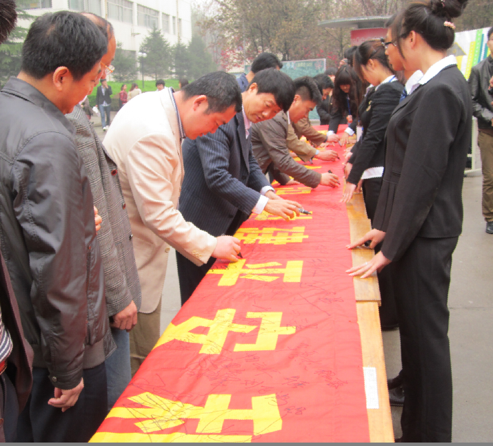 2012410中午1130在大学生活动中心门前举行“遵章守纪明礼修身”主题教育活动签名仪式。学院副院长李崇银,学生处处长王冠良,学生处副处长曲建利、任文友、王鹏,各二级学院行政副院长、辅导员老师及部分学生代表参加了签名仪式并现场签名。本次签名活动拉开了“遵章守纪明礼修身”主题教育活动月的序幕。