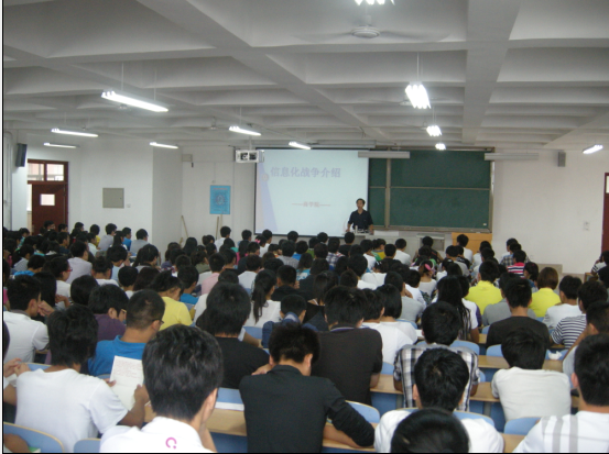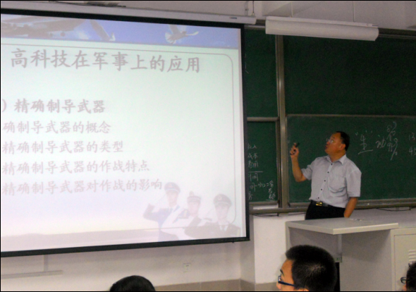 为深入贯彻落实《中华人民共和国国防教育法》,按照学院军事理论课教学计划安排,计算机学院行政副院长杨庆年、北校区商学院行政副院长曲永存于9月3日至9月8日在北校区分别为2012级普通本、专科新生开设《军事高科技》,《中国国防》《信息化战争》《国际战略环境》军事理论课。