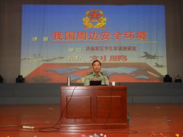 9月25日上午,我院邀请济南军区陆军学院军事理论教研室主任刘鹏大校做“我国周边安全环境”国防教育报告会, 报告会在南校区大学生活动中心举行。