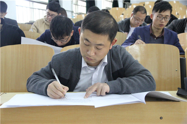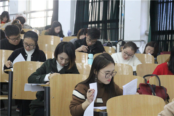 第一环节为理论考试,考核内容涉及党的十九大知识、学生规章管理制度、学生思想政治教育与日常管理、大学生资助政策、就业政策、心理健康教育等方面,主要考察辅导员对相关知识的掌握程度以及对信息的理解、分析和破解能力。全体辅导员参加了考试,笔试现场秩序井然,全体人员沉着冷静、认真作答。