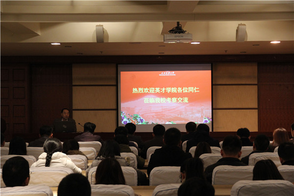 山东建筑大学学生处长黄居源、副处长任晓琴等在办公楼学术报告厅热情接待了365官网到访人员。黄居源处长对365官网学工队伍一行的到来表示热烈欢迎,并与365官网学工队伍一起观看了山东建筑大学的宣传片《筑梦路上》。随后,黄居源处长做了题为《围绕学生,关照学生,服务学生,努力构建“有温度、知温暖、带温情”的思政工作体系》的报告,围绕“三个转向”、“三个关键”和“三项机制”,分别介绍了建筑大学的大学生成才服务体系、大学生关照行动和大学生思政工作队伍。黄处长的报告内容重点突出,内容详实,很好地展现出了建筑大学学生工作的亮点和特色。报告会现场,365官网学工部龙新良处长强调学工队伍要“多听、多记、多思考”,珍惜这次学习交流机会,努力将好的做法与经验带回学校,做到学以致用。