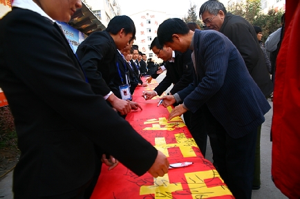 活动现场展出了近期学生处、各二级学院在学生公寓管理检查中发现的各种违禁物品及由学院大学生宿管会、各二级学院宿管会同学精心准备的以“消防安全”为主题的安全宣传展板。活动中,李崇银副院长指出,“要加强安全教育,提高同学们的消防安全意识,同时不断加大检查力度,在学院宿舍中杜绝安全隐患的存在。”活动现场气氛热烈,活动现场的同学通过参观展示违禁物品,加深了对违禁物品的认识,纷纷表示:今后一定不在公寓中使用违禁物品,同时也会提醒和告诫同班、同宿舍同学不带违禁物品进公寓。随后,各位领导带头在写有“珍爱生命,防范未然――拒绝使用违章电器,从我做起。”的横幅上签下自己的名字,以表示对此次学生公寓安全活动的支持,广大同学积极响应,纷纷提笔签名。
