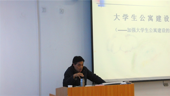 为指导和促进辅导员做好学生公寓管理工作,着力打造好学生公寓思想政治教育阵地,切实提高辅导员的公寓管理能力,学院特安排机械学院副院长孔祥泉副教授于11月22日下午在南校区学术报告厅为全院辅导员做“大学 生 公 寓 建 设 浅 析”的专题培训。