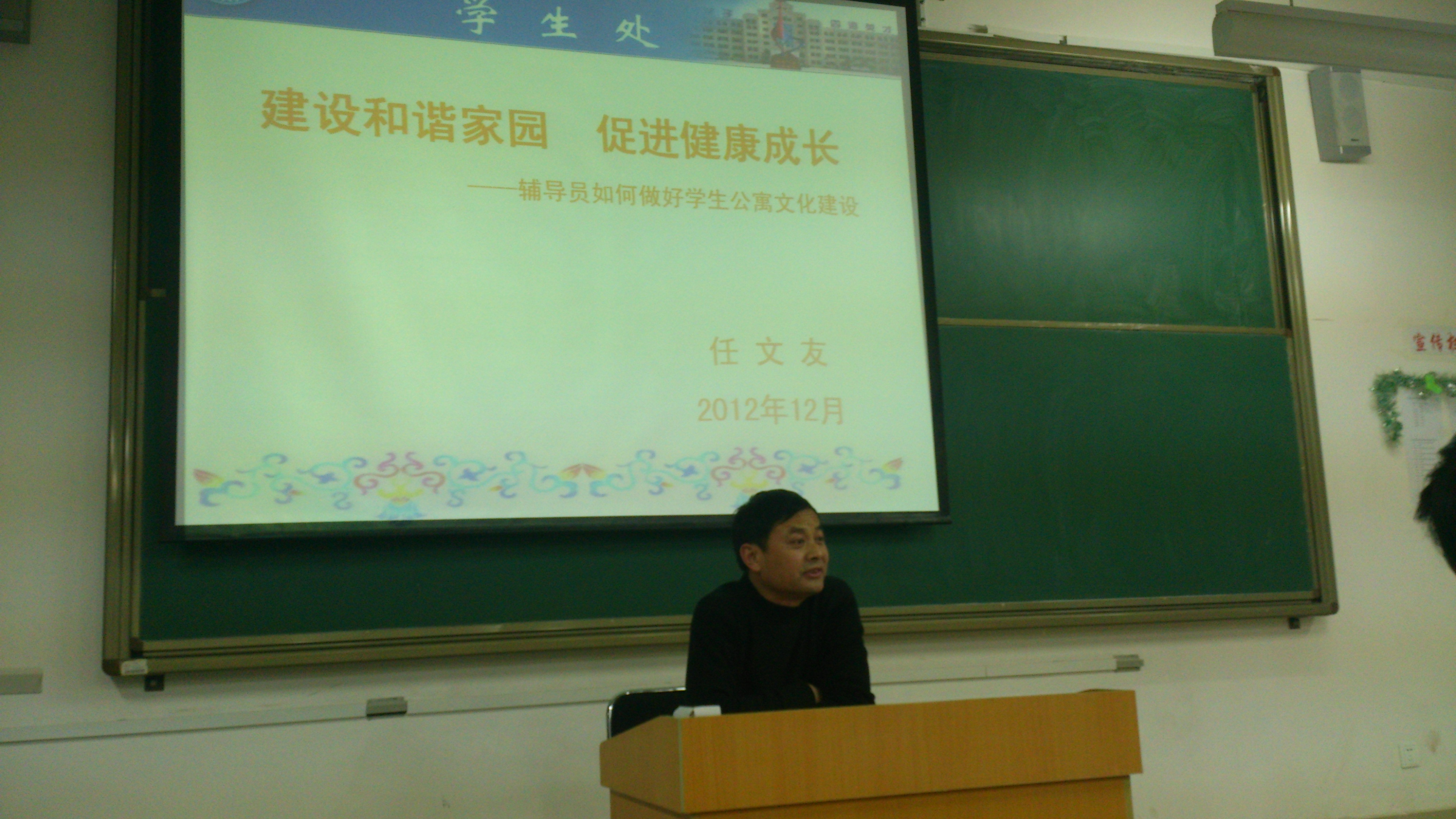 任处长的报告既生动又形象,以自身的体会从四个方面讲解了辅导员如何做好学生公寓文化建设:1、宿舍文化建设的内涵;2、宿舍文化的特点;3、当前我院宿舍文化建设中存在的问题;4、加强学生宿舍文化建设与管理的方法。任处长强调辅导员只有经常抓抓经常、反复抓抓反复才能做好学生管理工作。