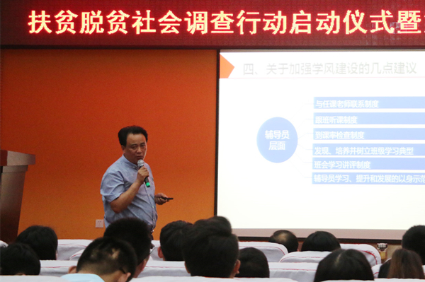 会议伊始,首先举行了扶贫脱贫社会调查2017年暑期专项行动启动仪式,对前一阶段开展扶贫脱贫社会调查工作情况进行了总结,表彰了完成较好的两个二级学院,同时,向扶贫脱贫社会调查2017年暑期专项行动实践团队授旗。