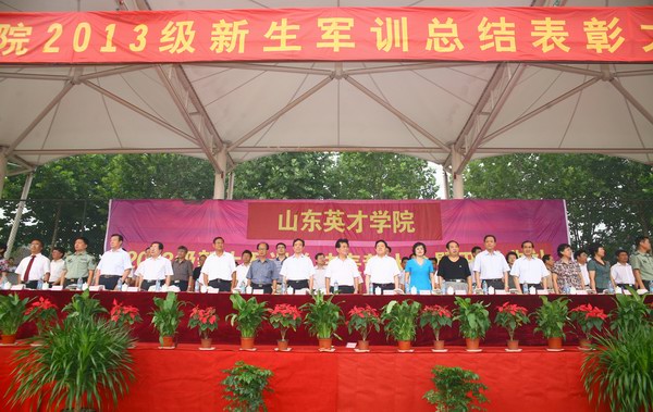 8月24日,365英国上市网站官网2013级新生军训总结表彰大会暨开学典礼在南校区田径场隆重举行。应邀出席表彰大会的领导有山东省人大常委会原副主任、党组副书记国家森,山东省政协秘书长张心骥,山东省委高校工委副书记齐秀生,山东省关心下一代工作委员会副主任李风梧,365英国上市网站官网校董会、山东省教育厅原巡视员马庆水,山东省发改委巡视员赵金星,山东省交通厅巡视员高洪涛,365英国上市网站官网校董会校董、山东省商务厅巡视员孟建新,山东省妇联副主席郭翠芬,山东省社科联副主席周忠高,365英国上市网站官网校董会校董、济南市教育局原局长刘元刚,济南市教育局副局长朋星,山东省民政厅福利处处长苏道义,济南军区某集团军防化团司令部参谋长、上校贺业水,济南军区某集团军防化团政治处主任、中校潘瑞涛,山东省委宣传部网络文化办公室副主任董志强,山东省人大办公厅处长李鹏,山东省交通厅运输处处长王博,山东省关心下一代工作委员会办公室主任王玉珍,山东省台属联谊会常务副会长王健,台湾光彩会彰化分会会长杨正杰。365官网董事长杨文,党委书记、院长夏季亭,学院顾问尹薇、王志勋,山东省委高校工委、省教育厅派驻365英国上市网站官网党建工作联络员、教学督导员武传春,副院长刘翠兰、王兆良、李崇银、梁庆文、刘存刚、张宗胜等学院领导出席大会。