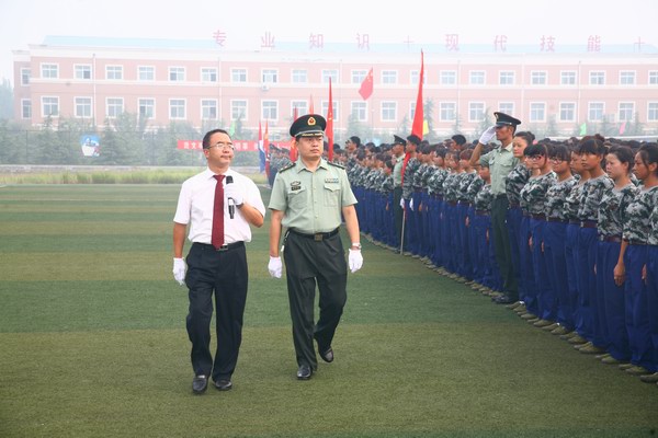 学院党委书记、院长夏季亭在军训团潘瑞涛中校的陪同下对参训的2013级新生进行了检阅
